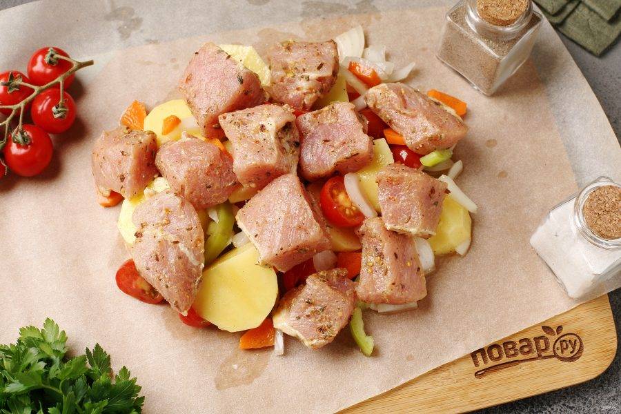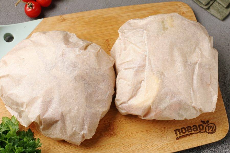 Заверните овощи с мясом в пергамент так, чтобы место шва оказалось вверху. Затем оберните ещё в 2-3 слоя пергамента для надёжности. Я разделила продукты на 2 порции, чтобы они пропеклись быстрее и равномернее, но можно сделать и 3-4 кулёчка из пекарской бумаги для порционной подачи. Запекайте в духовке при температуре 220 градусов около 60-80 минут. Ориентируйтесь на готовность картофеля.
