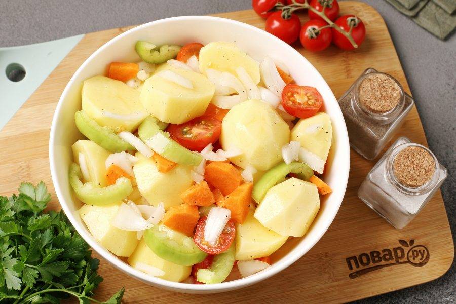 Лук, морковь, болгарский перец, помидоры и картофель измельчите произвольно, но не слишком мелко. Овощи соедините, добавьте растительное масло, соль и молотый перец по вкусу. Перемешайте.