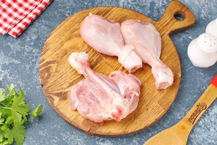 С куриных голеней необходимо снять цельное филе. Для этого снимите с голеней сначала кожу по направлению к суставу, по типу чулка.
