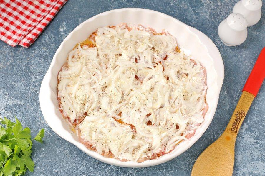 Смажьте майонезом или сметаной и выложите сверху нарезанный тонкими перьями лук. Лук слегка посолите и поперчите по вкусу.