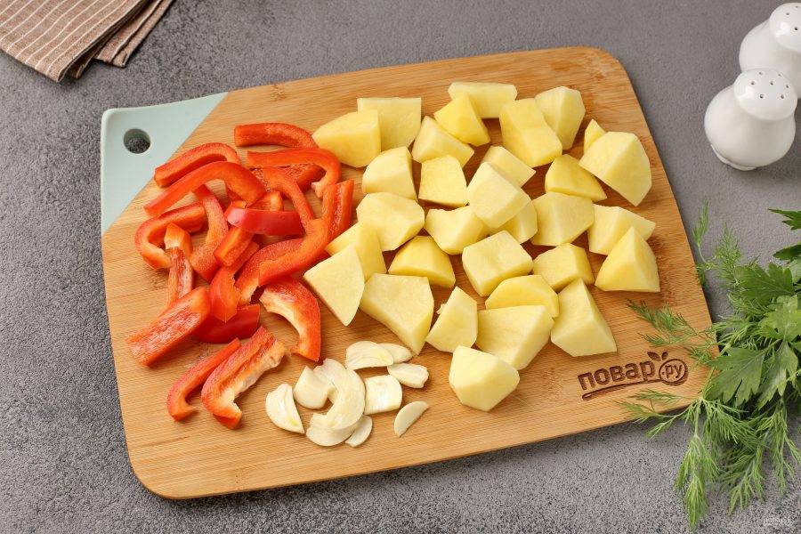 Болгарский перец нарежьте соломкой, чеснок пластинами или кубиками, а картофель дольками или средними кубиками.