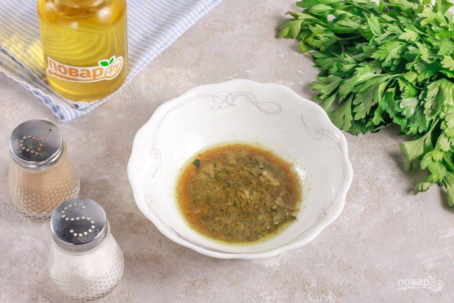 Цветочный мед, горчичный порошок или магазинную горчицу, соль, перец, очищенные зубчики укропа и измельченную зелень петрушки отпюрируйте блендером в однородную массу. Влейте растительное масло без аромата и перемешайте, получая красочный маринад.