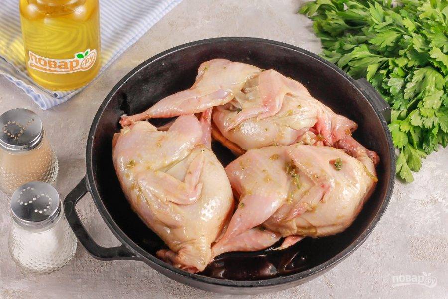 Обмажьте приготовленным маринадом тушки перепелов внутри и снаружи, оставьте их на 1-2 часа для пропитывания.