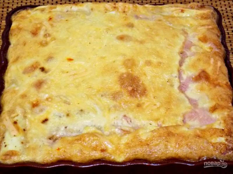 Для заправки соедините молоко, майонез, яйца в однородную массу. Залейте верх и засыпьте тертым сыром. Запекайте при t=180 40 минут, до румяной корочке.