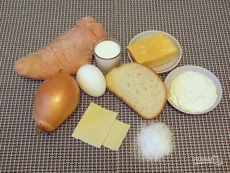 Пропустите в мясорубке куриную грудку, замоченную в воде, булку и лук. Соедините и перемешайте. Добавьте яйца, тертый сыр, соль и перец. Перемешайте и отбейте фарш.