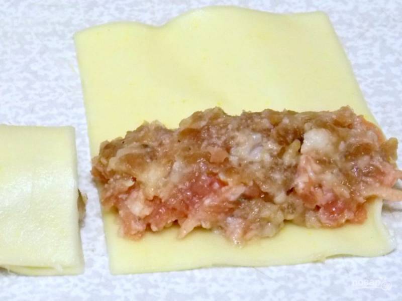 Положите на край каждой лапши полоску фарша и сделайте трубочку.