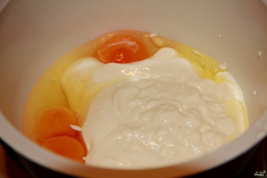 Выложите в форму овощи, потом залейте равномерно сметанно-яичной смесью. Она должна почти накрыть сметану, поэтому, в зависимости от размеров формы, сметаны и молока может понадобиться больше или меньше.