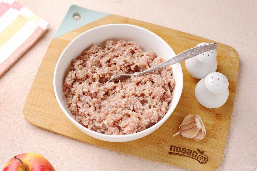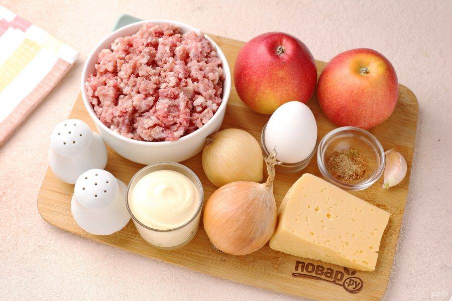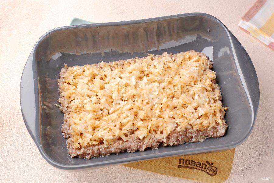 Яблоки очистите от шкурки, натрите на крупной тёрке, слегка отожмите и выложите равномерно на фарш. Можно сбрызнуть яблоки лимонным соком.