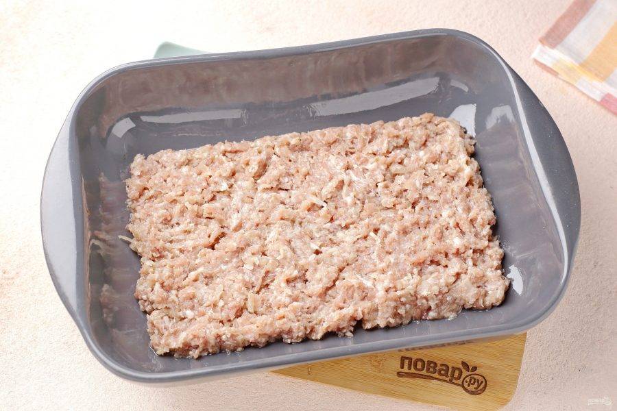 Переложите фарш в смазанную маслом форму. Толщина слоя примерно 3-4 см.