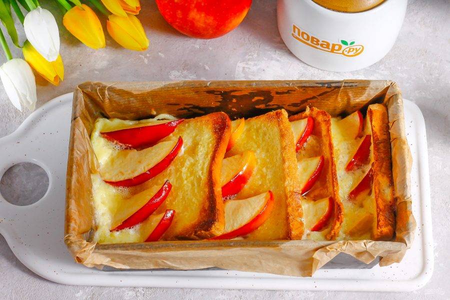 Яблоки разрежьте на четвертинки, срежьте семенные блоки и промойте. Нарежьте ломтиками. Смажьте форму или пергаментную бумагу сливочным маслом, чтобы запеканка не пристала к ней в процессе приготовления. Выложите ломтик хлеба, а на него — ломтики яблок. И т.д., чередуя слои.