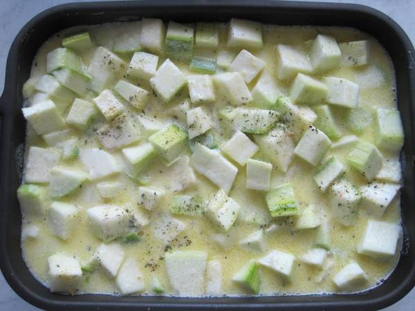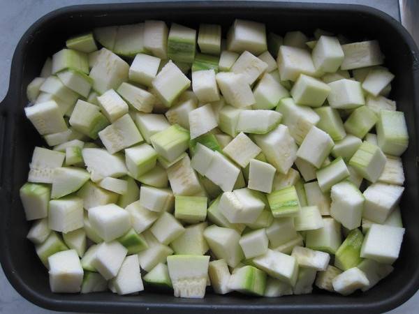 Кабачок так же промываем и нарезаем на небольшие кубики, равномерно раскладываем их поверх курицы.