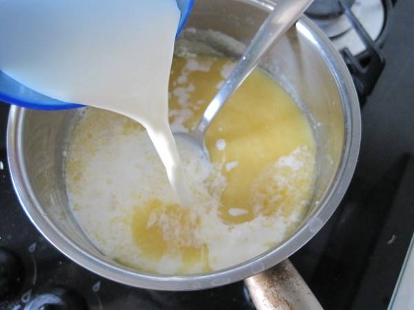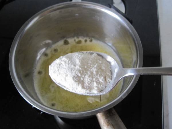Затем высыпаем в кастрюльку муку и обжариваем ее на масле до золотистого цвета.