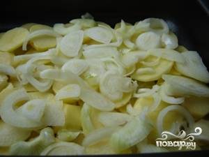 Залить сметанным соусом, посыпать тертым сыром, накрыть фольгой и отправить в разогретую до 180С духовку на 40 минут. Затем фольгу осторожно открыть и дать запеканке зарумяниться. Слегка остудить и подавать на стол горячей - прямо в форме или на порционных тарелках.