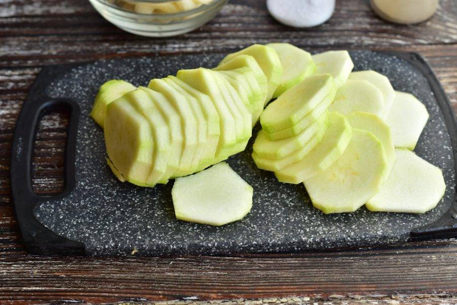 Кабачок вымойте, очистите, нарежьте кружочками.