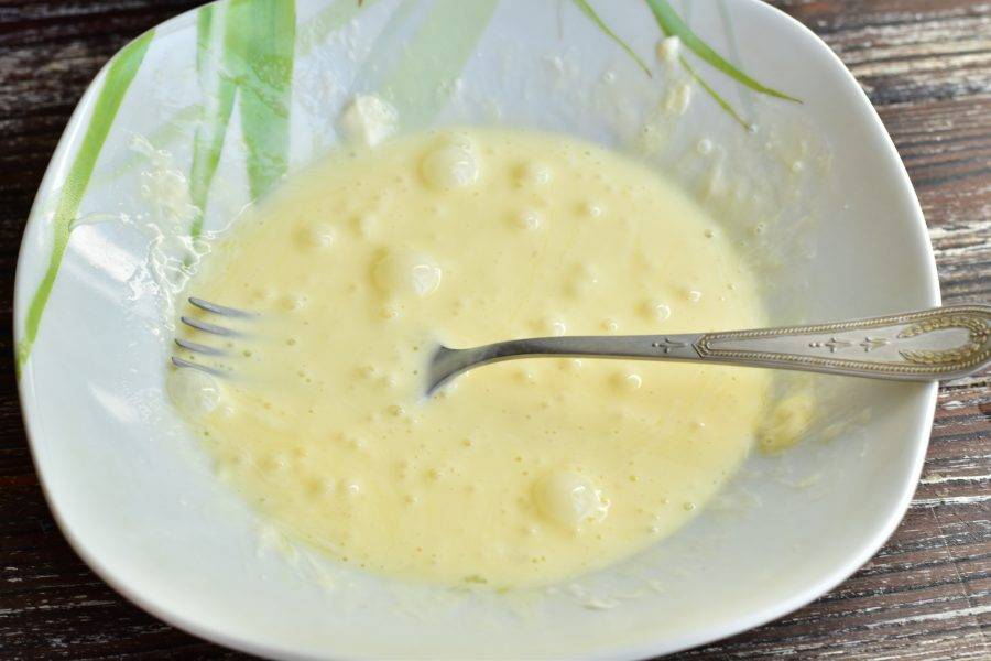 В миске взболтайте вилкой яйцо и майонез.