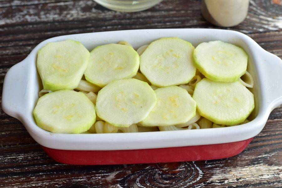 На макароны выложите оставшиеся кружочки кабачков. Посолите и поперчите их.