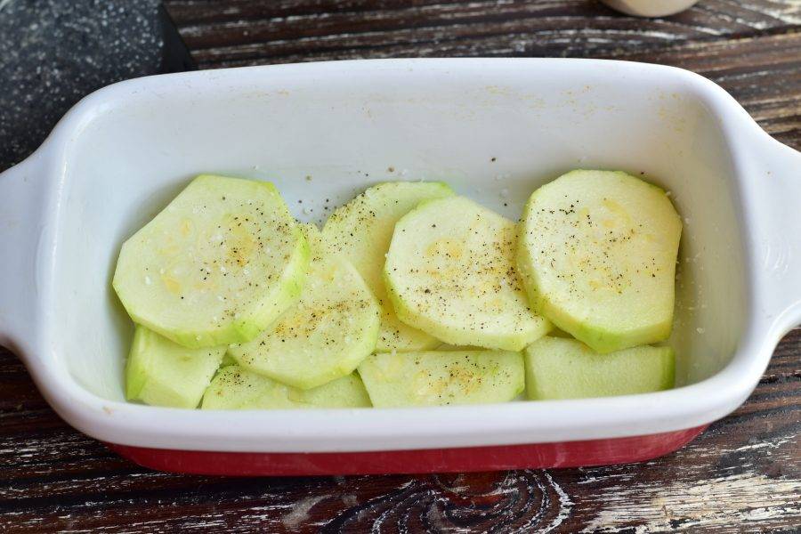 Выложите половину кружочков в форму для выпекания. Посолите и поперчите овощи.
