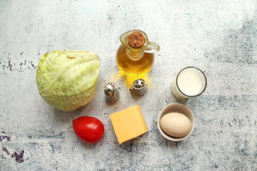 Подготовьте все необходимые ингредиенты для приготовления запеканки из молодой капусты. У капусты удалите верхние и загрязнённые листья. Капусту и помидоры вымойте и обсушите.