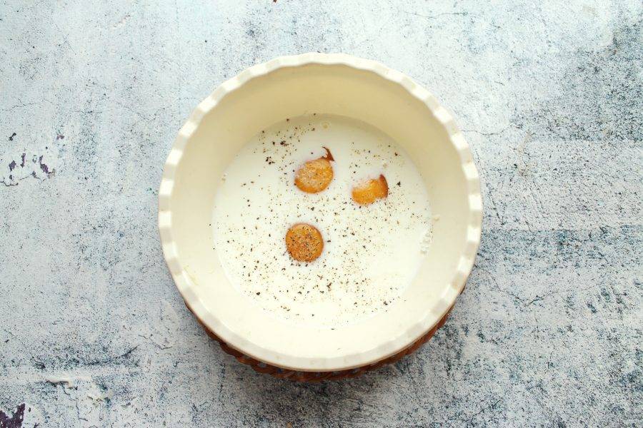 В миску разбейте яйца, влейте молоко, посолите и поперчите. Всё хорошо перемешайте и залейте капусту с помидорами. Ещё немного примните капусту, чтобы она была в яично-молочной массе.