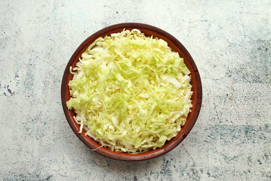 Капусту нашинкуйте тонкой соломкой. Форму для запекания диаметром 18 сантиметров смажьте растительным маслом и выложите в нее капусту, приминая.