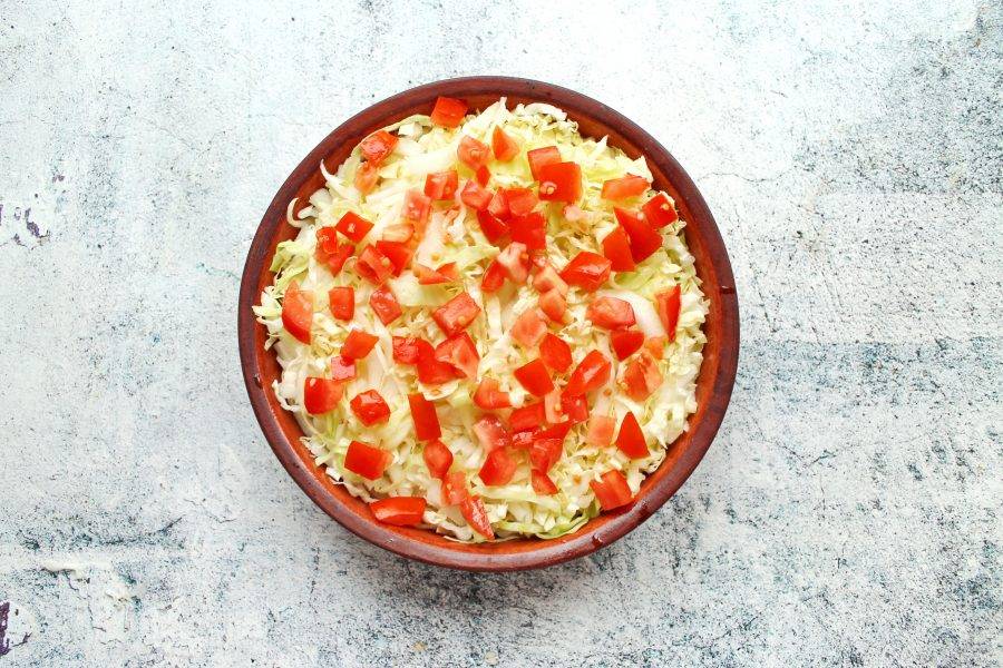 Помидоры порежьте мелким кубиком и разложите поверх капусты.