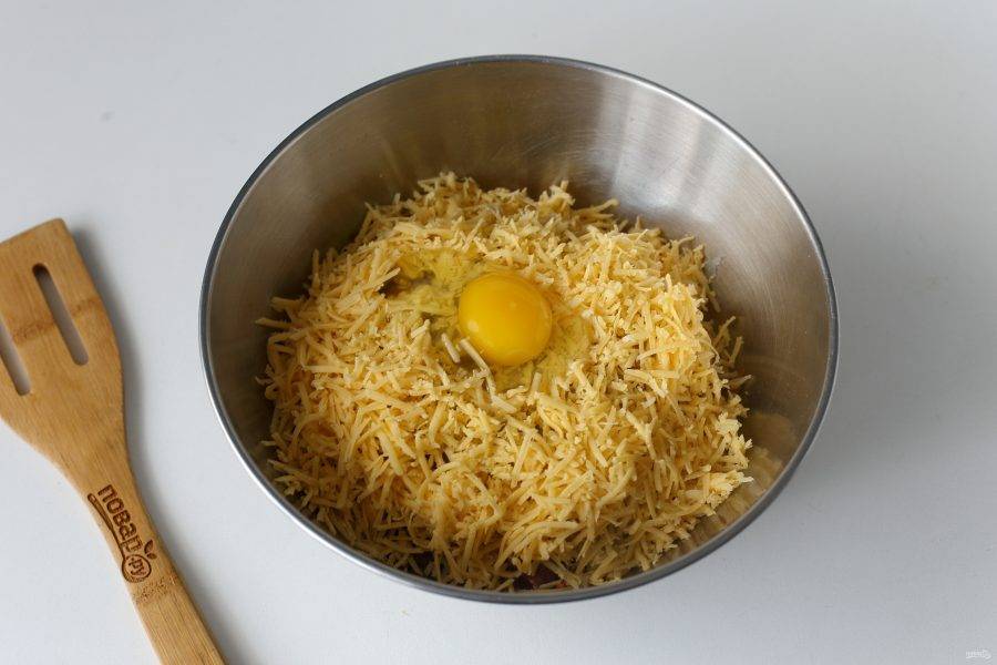 Сыр натрите на мелкой терке, добавьте яйцо.