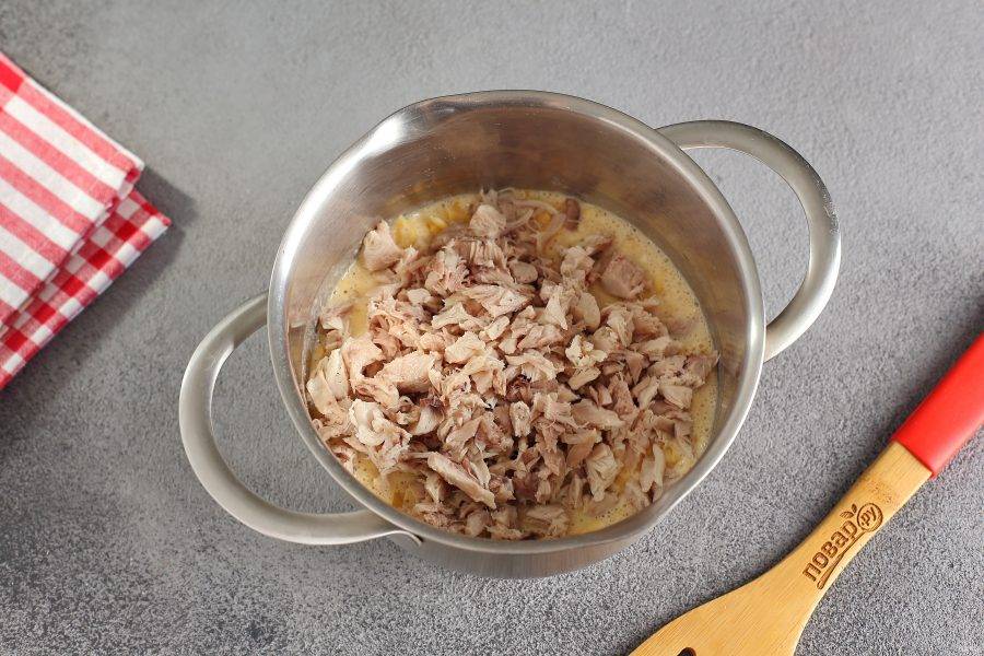 В конце добавьте нарезанную небольшими кусочками курицу.