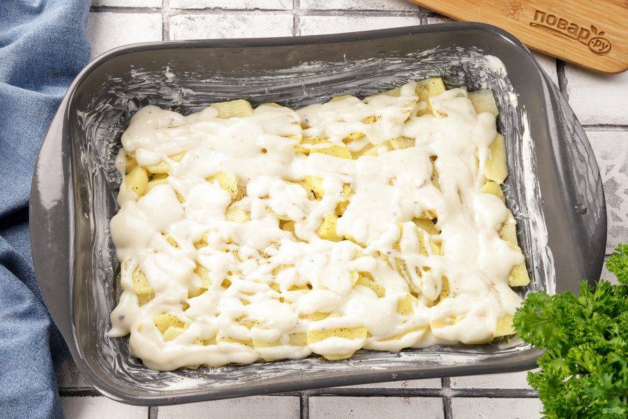 Выложите слой из картофеля. Посолите и поперчите по вкусу.
