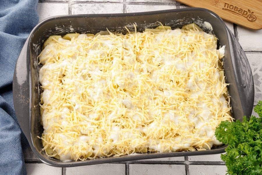 Снова полейте всё соусом Бешамель и посыпьте тёртым сыром.