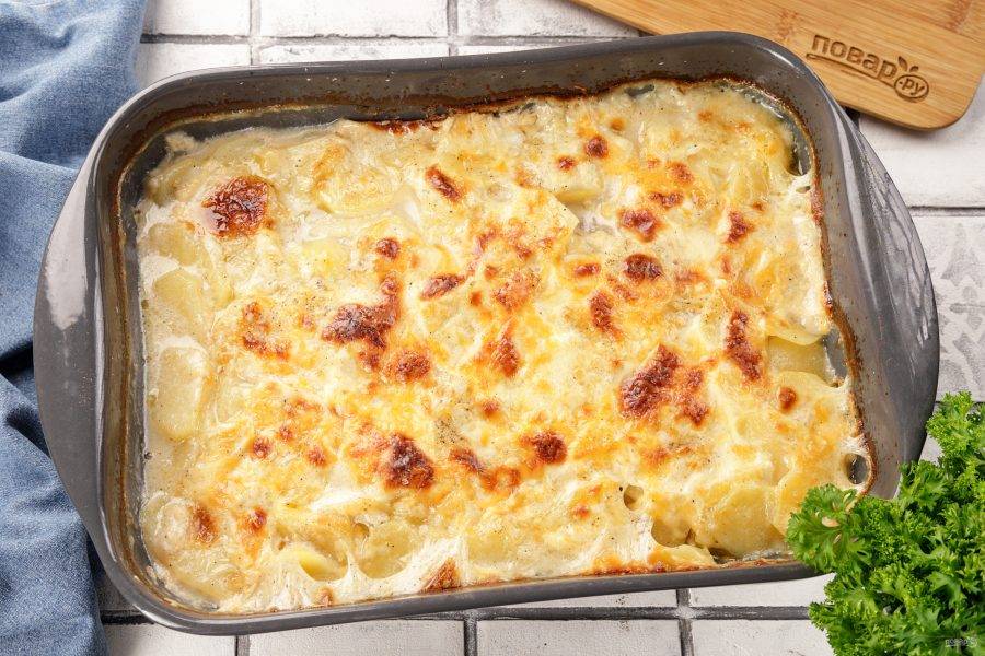 Накройте форму фольгой и готовьте при 200 градусов около 40 минут (ориентируйтесь на готовность картофеля), затем фольгу уберите и готовьте ещё 10-15 минут, чтобы верх подрумянился.