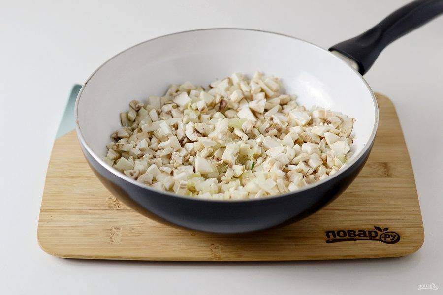 Лук и шампиньоны нарежьте на мелкие кубики и обжарьте в сковороде до испарения лишней жидкости. Посолите и поперчите по вкусу.