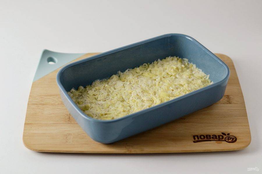 Смажьте форму для выпечки маслом, на дно выложите половину картофеля. Плотно утрамбуйте.