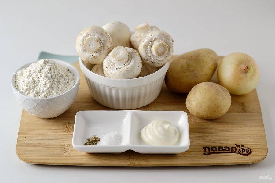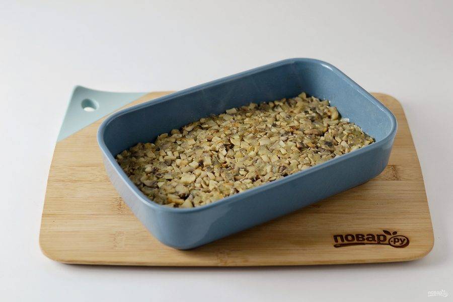 Следующим слоем выложите начинку из грибов и лука. Сверху накройте второй половиной картофеля.
