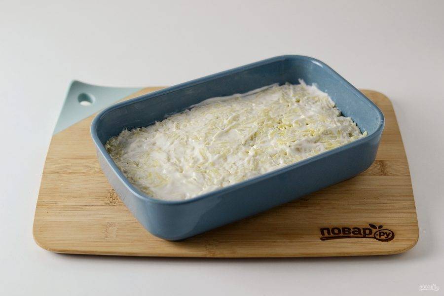 Смажьте верх майонезом. Выпекайте запеканку 45-50 минут в заранее разогретой духовке до 180 градусов.