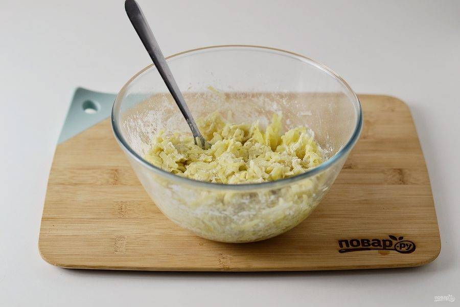 В большой миске соедините картофель с мукой, солью и перцем. Перемешайте.