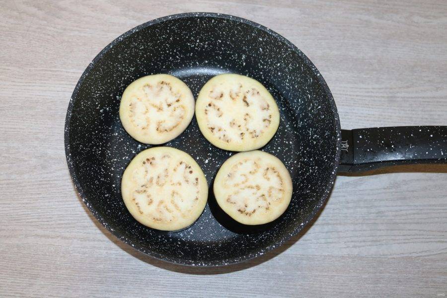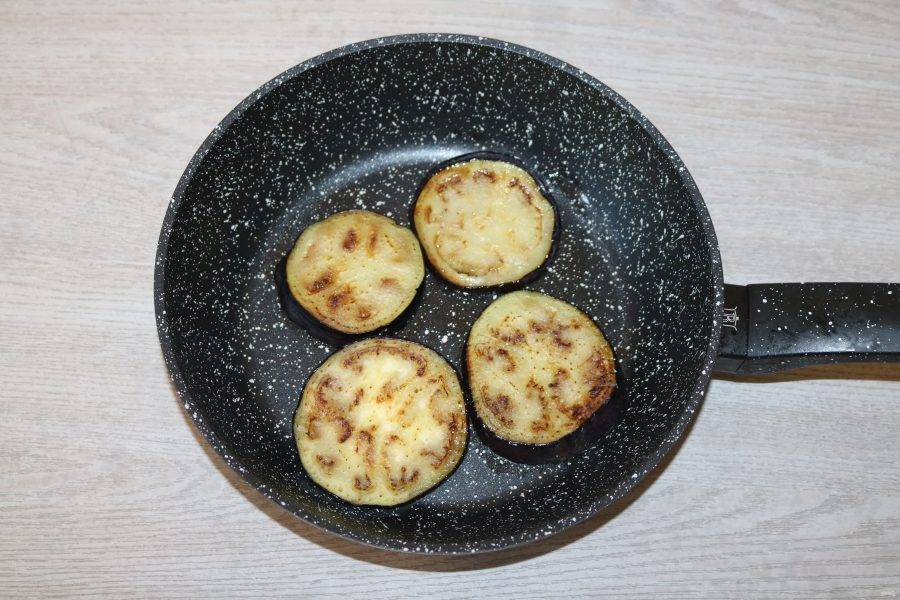 Баклажаны обжарьте на разогретой сковороде с добавлением небольшого количества масла.