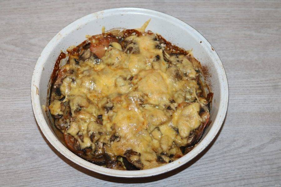 Сверху натрите сыр на крупной тёрке. Отправьте в разогретую духовку до 200 градусов.
