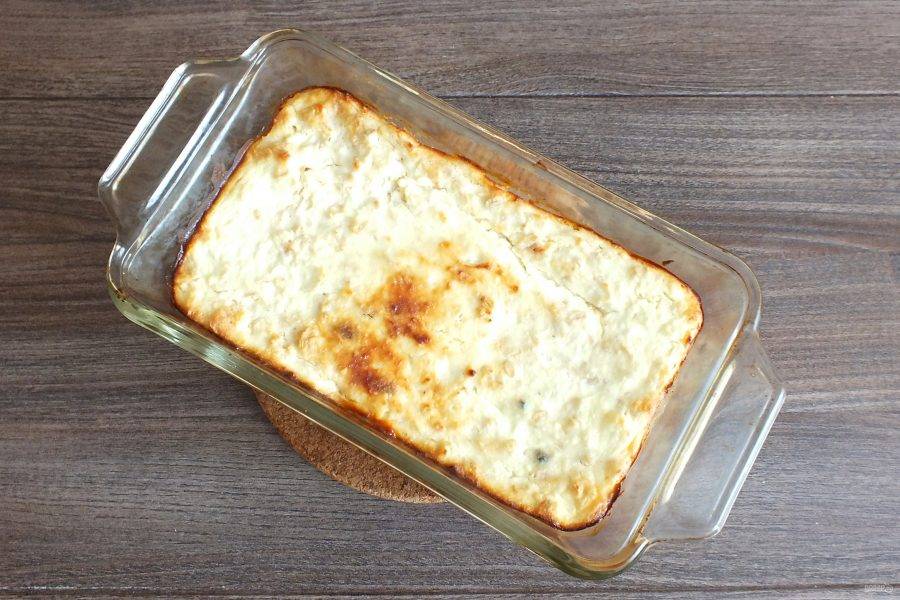 По истечении времени достаньте запеканку из духовки. Проверьте готовность. При нажатии на неё, она должна быть упругой. Готовую запеканку охладите до комнатной температуры.