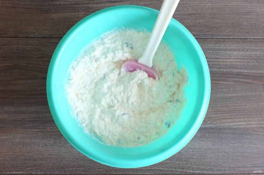 Добавьте к творожной массе изюм, овсянку, натертые яблоки, ванилин.