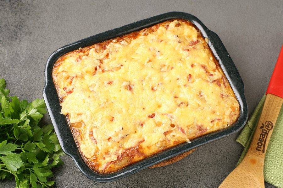 Запеканка "Сырые макароны" готова. Нарежьте её на порции и подайте к столу. Приятного аппетита!
