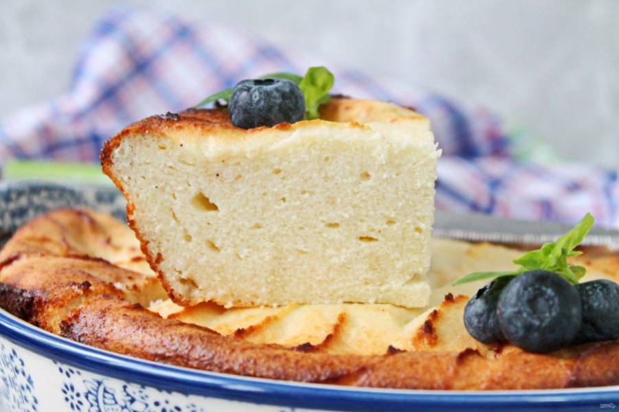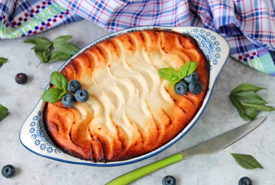 Поставьте форму в горячую духовку и запекайте творожную запеканку в течение 30-40 минут при температуре 180 градусов. Верх должен зарумяниться, а масса уплотниться.
