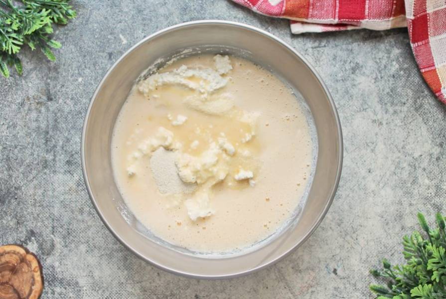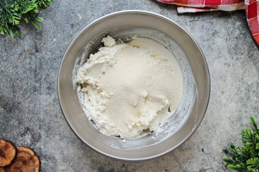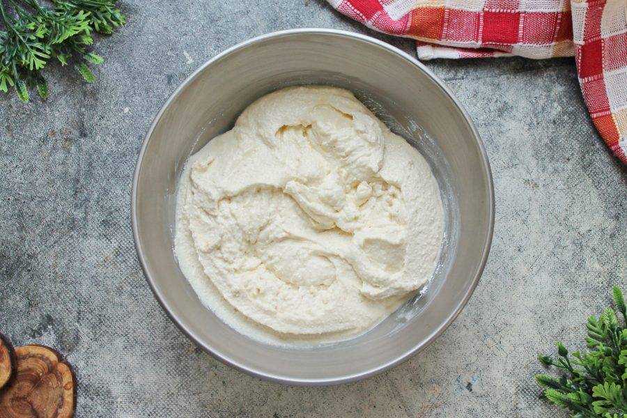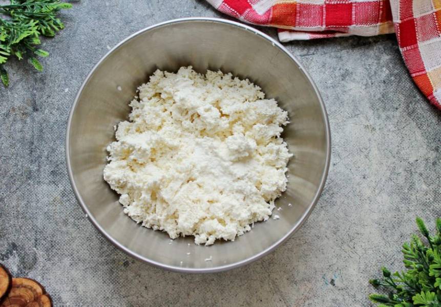 Миску с творожной массой накройте и оставьте на кухонном столе на 25 минут, чтобы манка впитала в себя жидкость и набухла.