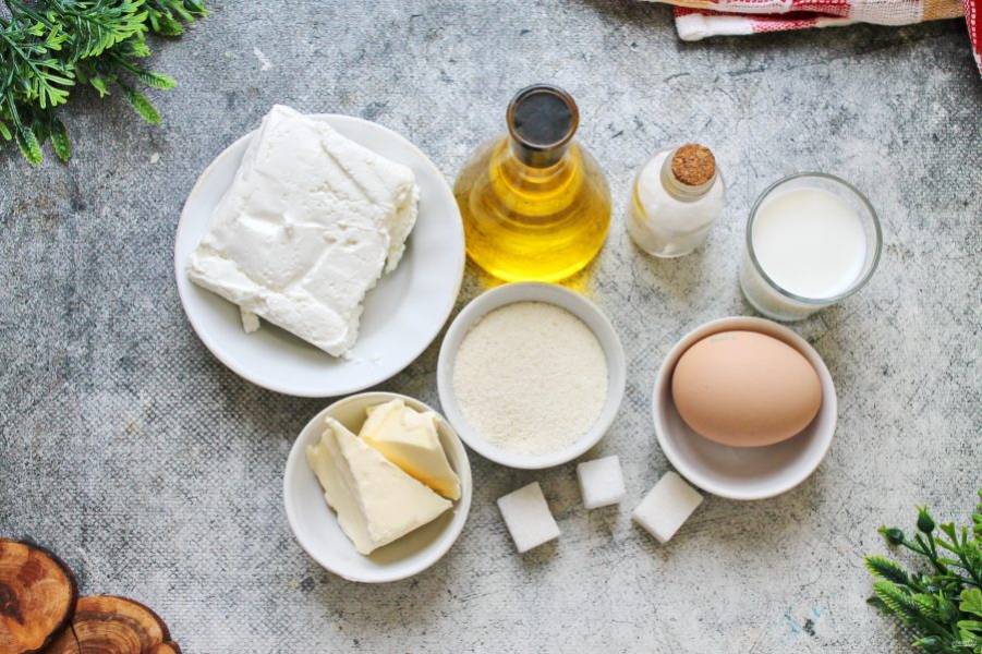 Подготовьте все необходимые ингредиенты для приготовления запеканки творожной как в детском саду. Сливочное масло достаньте заранее, чтобы оно стало мягким.