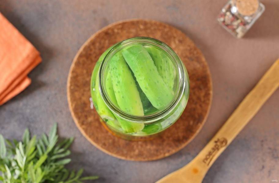 Кипящим рассолом залейте огурцы, добавьте уксус (из расчета 1 ч.л. на 1 литровую банку), банки закрутите или закатайте металлическими крышками. Переверните, укутайте и оставьте до остывания.