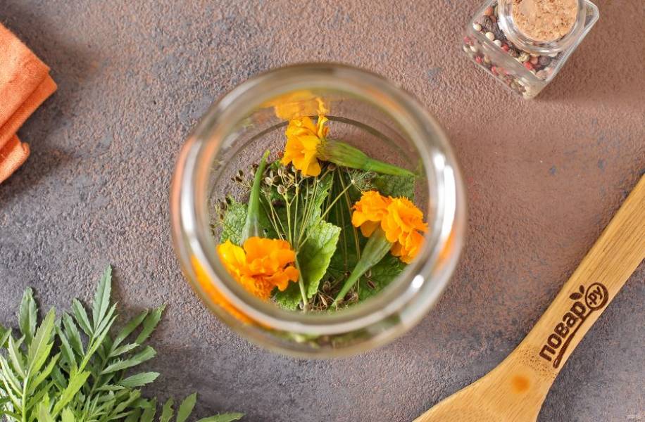 В стерилизованную банку выложите промытые листья смородины, укроп, гвоздику, перец горошком и цветки бархатцев. На 1 литровую банку трех штук будет достаточно.