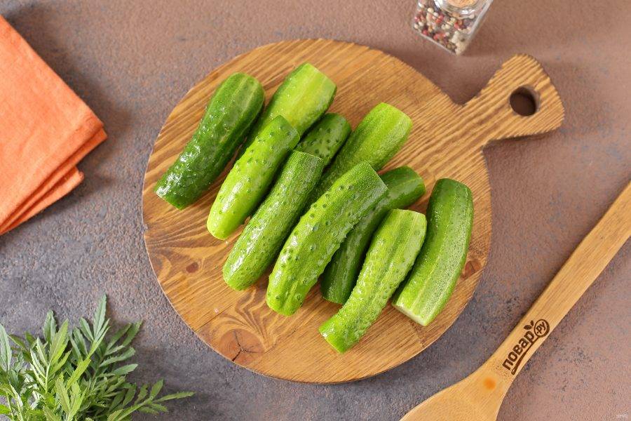Огурцы замочите в холодной воде на 2 часа, затем промойте и обсушите.
