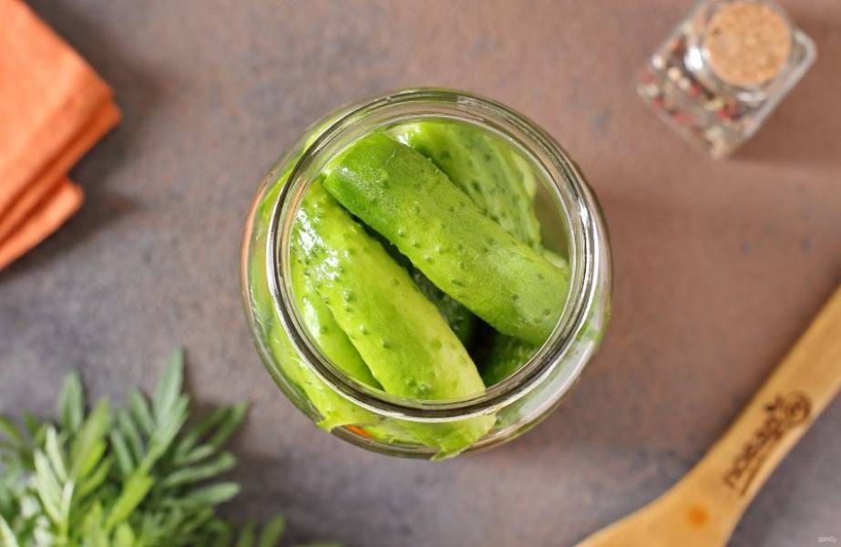 Залейте огурцы кипятком, банку прикройте крышкой и дайте постоять 10 минут.