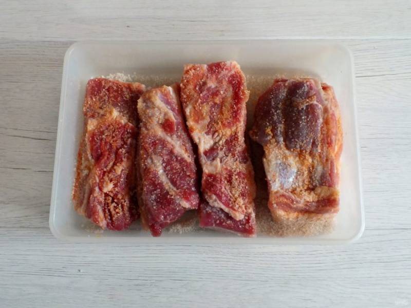 Возьмите просторный лоток с крышкой. Сало нарежьте на куски, чтобы они свободно помещались в этот лоток. Дно присыпьте тонким слоем посолочной смеси. Каждый кусок сала тщательно натрите солью с перцем.