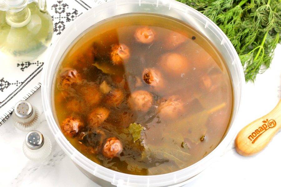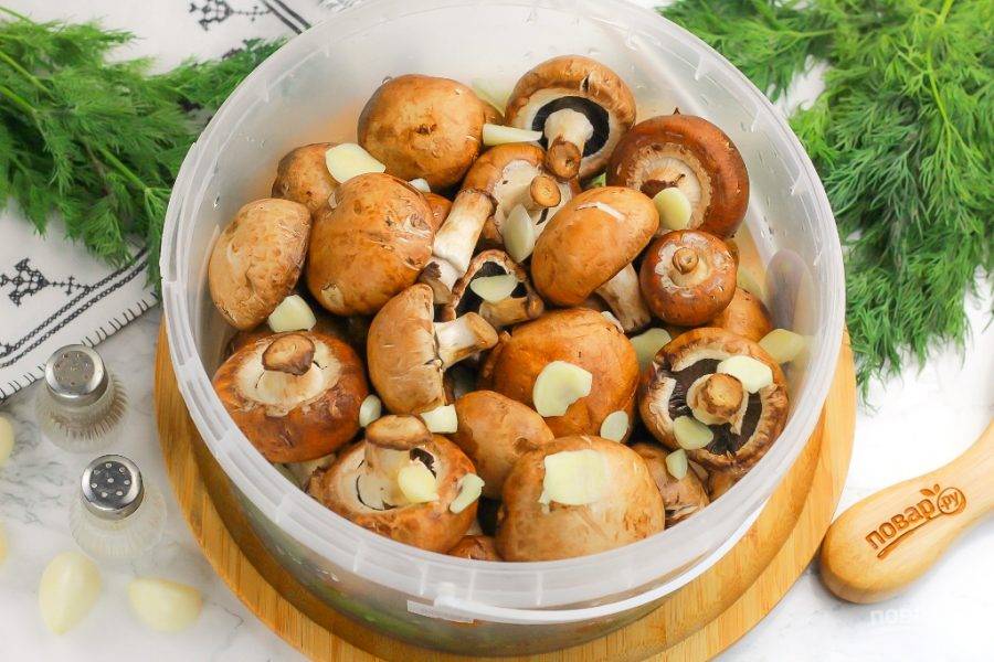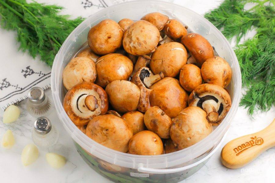 Залейте рассол в емкость с грибами, он должен покрывать шампиньоны. Имейте в виду, что грибы будут подниматься на поверхность жидкости.