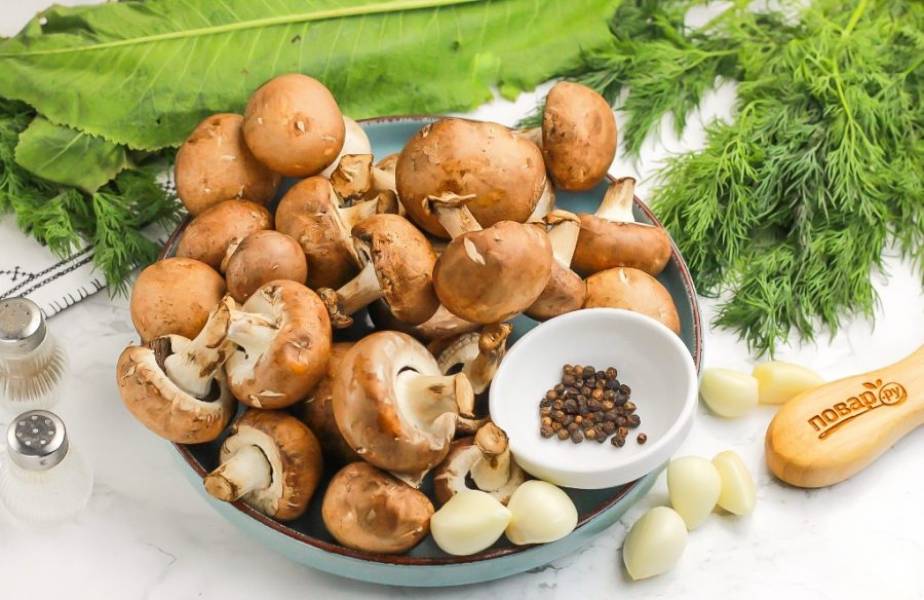 Подготовьте указанные продукты. Можно использовать как белые шампиньоны, так и коричневые (королевские), а вместо листьев хрена добавить листья дуба, укропные зонтики.